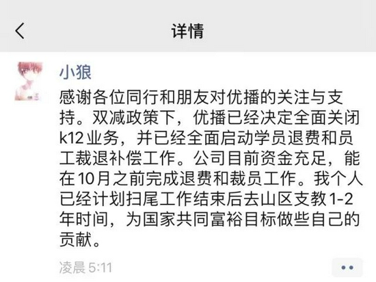 据悉,新东方在线副总裁、东方优播CEO朱宇也在朋友圈发文证实上述消息。朱宇称目前公司资金充足,已全面启动学员退费和员工裁退补偿工作,预计能在10月之前完成。至于个人计划,朱宇称将在扫尾工作结束后,去山区支教1-2年时间。