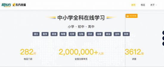 据悉,东方优播主打中小学全科在线学习,以在线直播课程为核心主营业务,辅以在线一对一课程、私播优选(录播课程)。官网数据显示,东方优播在全国共有282所校区门店,全国注册学员超过200万+。