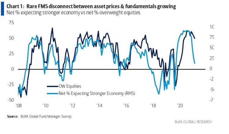 以Michael Hartnett为首的美国银行策略分析师们周二在一份报告中表示:“对基金经理们进行的调查显示,他们认为资产价格与基本面之间的脱节正在加剧。””另一方面,增长预期表明,股票配置比例应该下降,但风险承受能力表明,购买股票型基金的投资者们正在忽视宏观因素。”