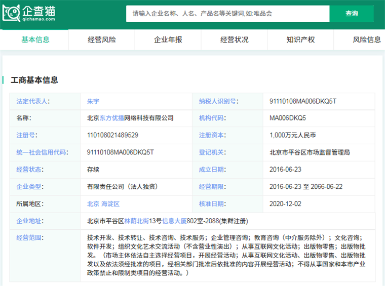 企查猫显示,东方优播运营实体为北京东方优播网络科技有限公司,注册资本1000万人民币。2016年6月由新东方集团与新东方迅程(即新东方在线)共同投资成立,时任新东方优能一对一业务负责人的朱宇兼任CEO。2019年,新东方在线作价9400万元收购剩余49%股权,将东方优播并为集团附属全资子公司。