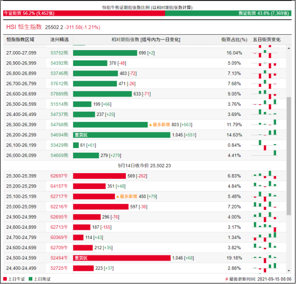街货分布方面,至周二,恒指牛证街货贴价区间主要在收回价24900点至25400点之间,累计相当约2263张期指合约;恒指熊证街货在收回价26000点至26500点,累计相当约2425张期指合约。