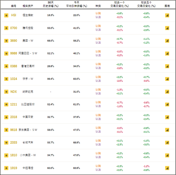 周二恒指相关权证的平均引伸波幅报约22%。个股方面,快手相关认购证的引伸波幅按日调升2.2%;长城汽车相关认沽证的引伸波幅则按日调升2.3%。