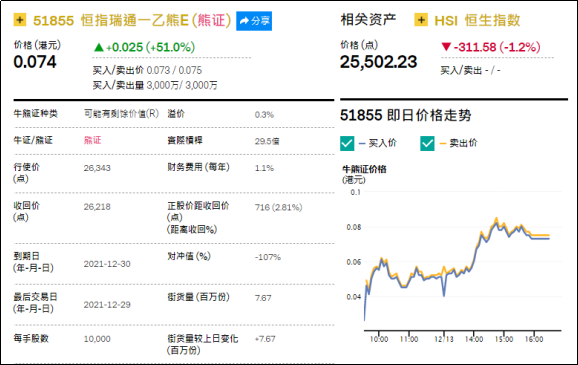 1、强势轮证:恒指瑞通一乙熊E(51855.HK),周二大幅上涨51.02%;