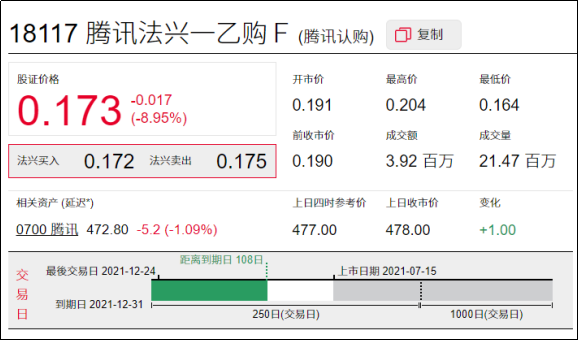 2、看错方向:腾讯法兴一乙购F(18117.HK),周二下跌8.95%。