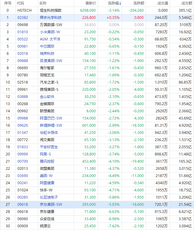 恒生科技指数大跌3.14%,明源云跌近8%,众安在线、京东健康跌近7%,京东跌近6%,快手跌近5%,美团跌超4%,腾讯跌超4%。