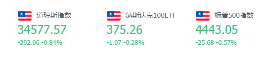 道指跌292.06点,或0.84%,报34577.57点;纳指跌67.82点,或0.45%,报15037.76点;标普500指数跌25.68点,或0.57%,报4443.05点。