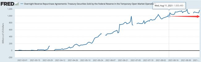 周二(9月14日),美联储逆回购工具(RRP)使用规模达到了1.169万亿美元,再创历史第二高,同时,这也是美联储逆回购工具的使用量连续第24个交易日(自8月11日开始)突破万亿美元大关。