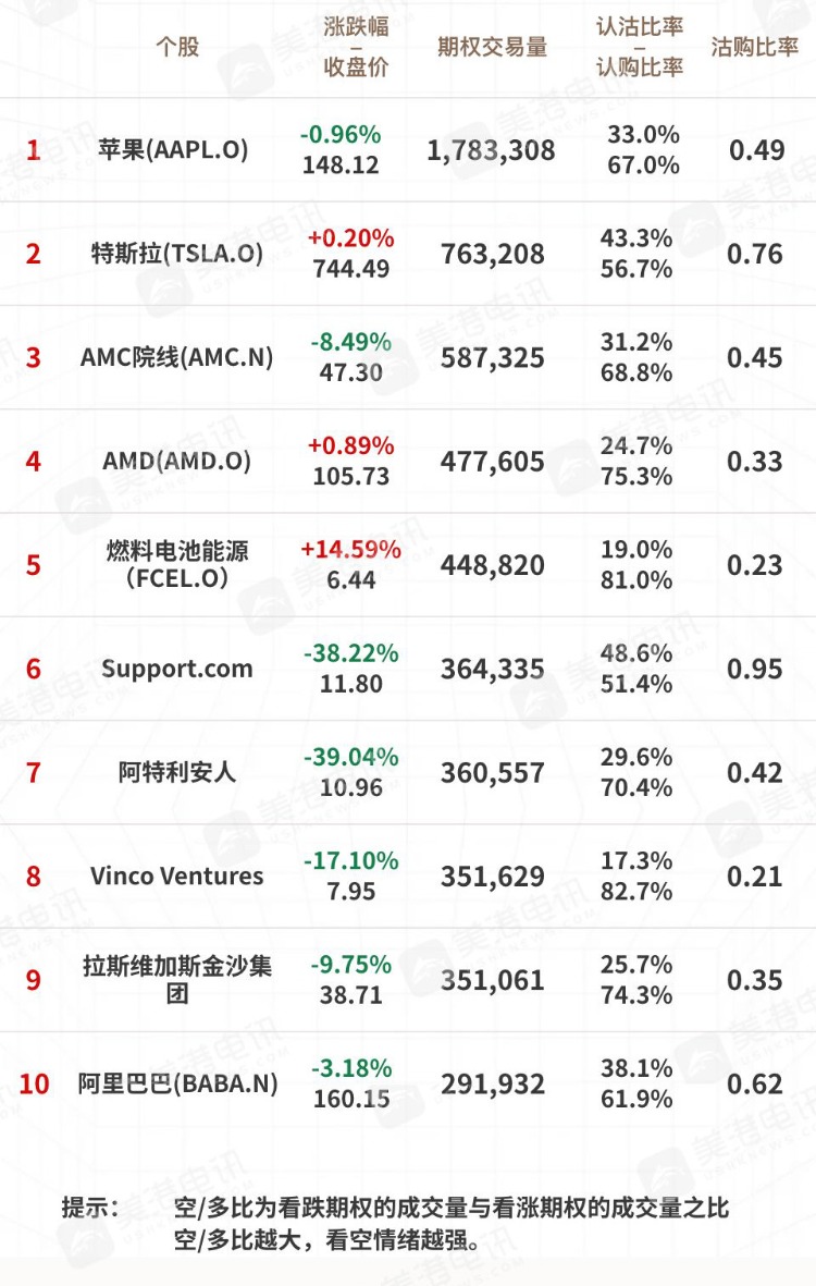 特斯拉(TSLA)期权交易量从上一交易日的81.2万张降至76.3万张,空/多比从0.87降至0.76,看空情绪减弱。