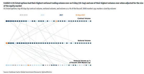2、刚过去的周五(9月10日)是美国上市期权市场的第一个2万亿美元名义交易量日。将期权名义交易量与股票市值相比,上周五也创下了最大交易量的记录。