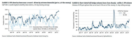 3、大量对冲:在短线临近到期日的期权对冲交易量很大的情况下,Skew曲线的左侧(downside,即下行)斜率非常大。高盛指出,尽管横切挂钩标的和波动率曲面(Vol Surface)的skew曲线斜率很大,但SPX左侧的交易仍表现强劲。短线临期的期权对冲量在提升:1到3个月的SPX深度价外看跌期权的交易量处于底部范围,然而近两周来,有15%的距离到期日不足一个月的深度价外看跌期权价格却创下了自2020年新冠疫情爆发以来的新高。