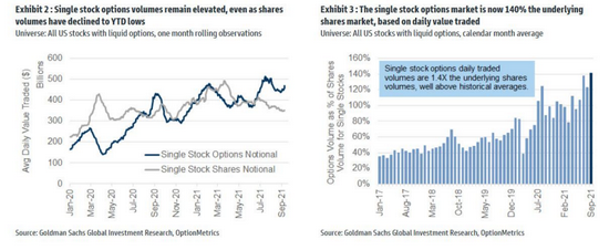 个股期权9月至今的名义交易量已经达到5000亿美元/日,是标的个股交易量的140%。