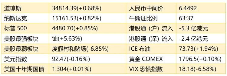 1、隔夜美股截至收盘,道指涨236.82点或0.68%,报34814.39点;纳指涨123.77点或0.82%,报15161.53点;标普500指数涨37.65点或0.85%,报4480.70点。港股ADR指数上涨,按比例计算,收报25268点,涨234.68点或0.93%。