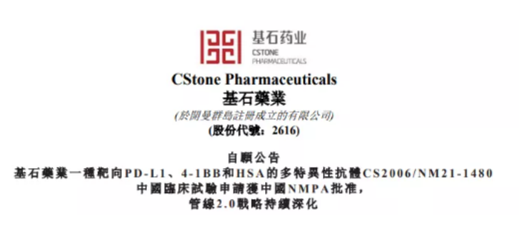 9月15日,基石药业宣布,多特异性抗体CS2006(NM21-1480)在中国的临床试验申请(IND)获国家药监局的批准。
