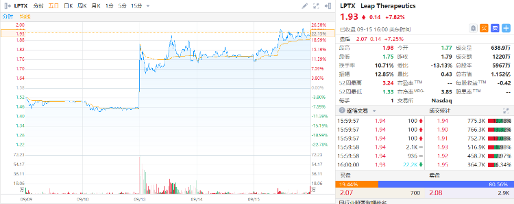 截至昨日(9月15日)美股收盘,Leap Therapeutics(LPTX)涨7.82%,报1.93美元。