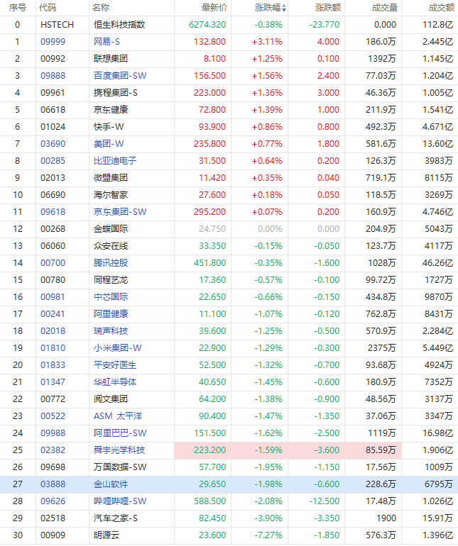 其中,网易涨超3%;联想集团、百度、携程、京东健康涨超1%;快手、美团、比亚迪电子等微涨。