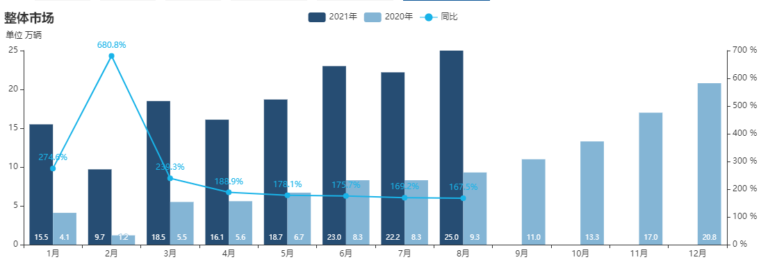 然而在新能源市场又是另一番景象,8月新能源汽车产销分别完成30.9万辆和32.1万辆,同比均增长1.8倍。其中纯电动汽车产销分别完成25.2万辆和26.5万辆,同比均增长1.9倍;插电式混合动力汽车产销均完成5.6万辆,同比分别增长1.4倍和1.7倍;燃料电池汽车产销分别完成40辆和38辆,同比分别下降58.8%和68.6%。