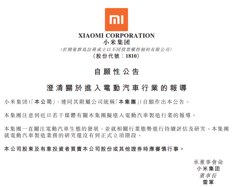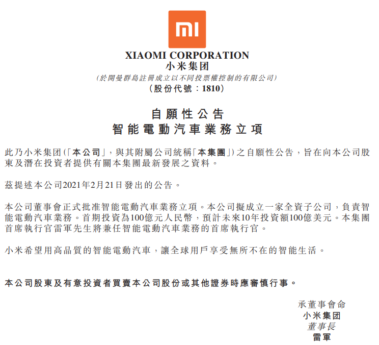 2月21日,小米公告表示,就电动汽车制造业务还没有到正式立项阶段。