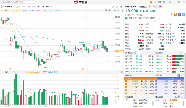 - 国泰君安(香港)发布研究报告称,公司2021年上半年业绩在高运价下展现巨大弹性。其中,由于运价骤增及货运量的恢复,集装箱航运业务收入取得90.6%的同比增幅至人民币1364.38亿元。考虑到货运量可能受较紧的远洋运输资源以及低运输效率所限制,该行认为货运需求在后续释放的可能性高。加上航运运力供应偏紧,运价有望在年内保持高位,对公司净利率形成利好。