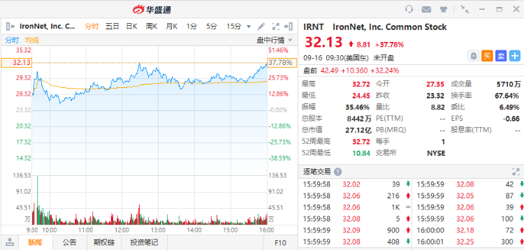 华盛资讯9月16日消息,网络安全服务提供商IronNet(IRNT)盘前涨32.24%,隔夜大涨37.78%。此前公司2022年Q2财报实现营收610万美元,每股收益为-0.17美元;预计2022财年营收仍在4,300万美元至4,500万美元之间,高于市场预期。