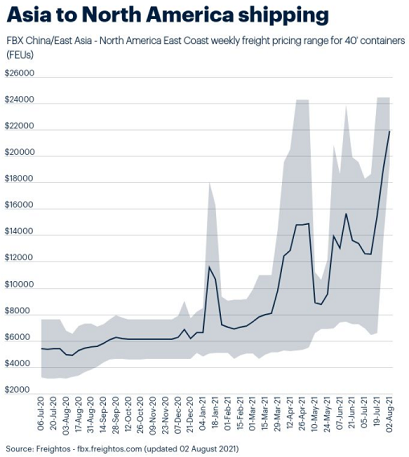 举个例子,2020年1月一个普通集装箱从中国上海,运到美国西海岸洛杉矶的价格是1000多美元;2021年8月2号,这个价格涨到了16000美元;2021年8月2号,这个价格突破了2.2万美元。