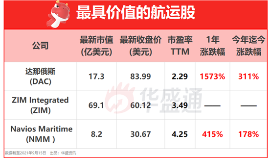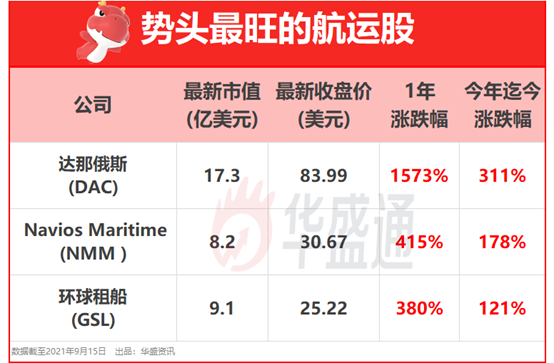全球涨幅最大的要数船舶租赁公司达那俄斯 $DAC ,这是一家总部位于希腊的全球货柜船运营公司,过去12个月累涨近1600% 。分析师认为,尽管该股票涨幅巨大,但未来还有进一步上涨的空间,该公司将在未来几个季度将会有大量现金入账。