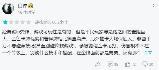 和传统卡牌游戏不同的是:策略和运气在游戏对战中占到的比例非常小,而卡牌的等级和强度才是对决的关键。所以“贫民玩家”们想要靠着自己的巧思战胜“氪佬”几乎是不可能的。