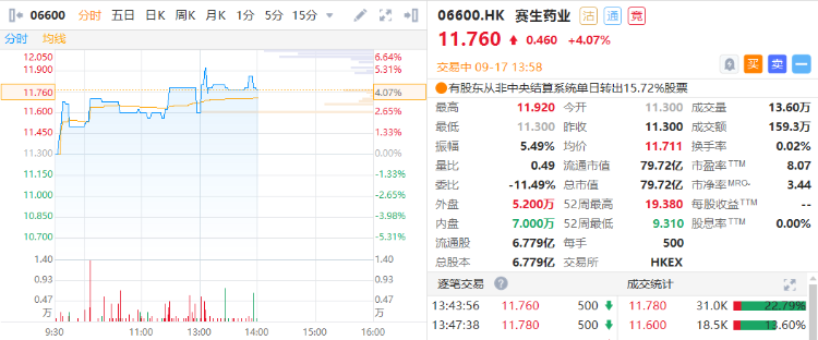 截至发稿,赛生药业涨4.07%,报11.76港元。