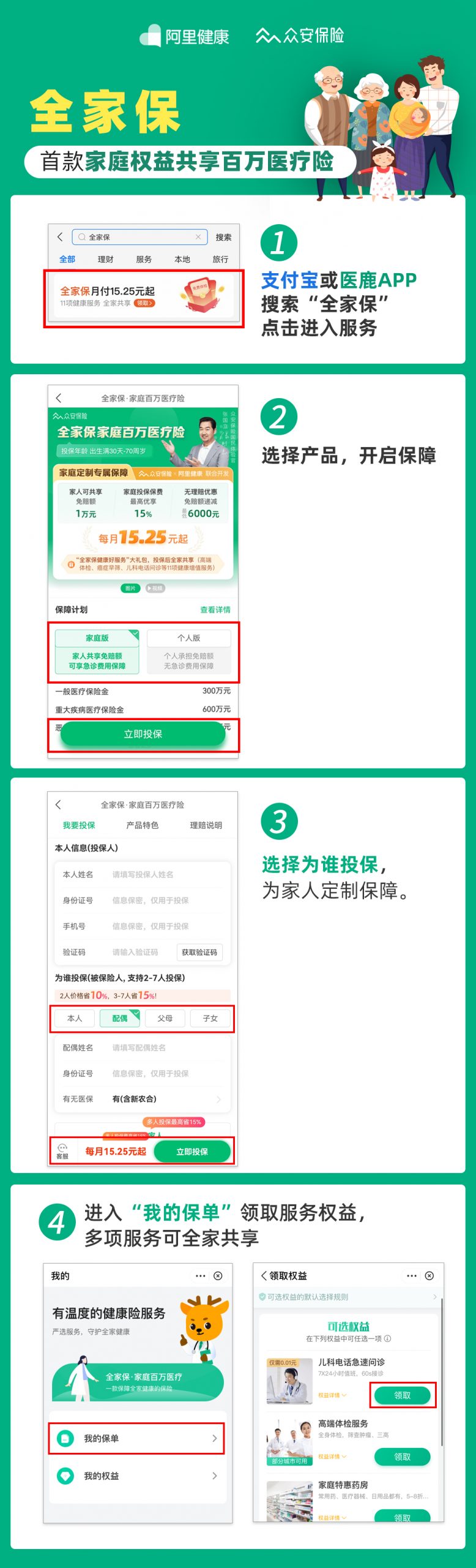 即日起,用户可以在支付宝或医鹿APP搜索“全家保”进入家庭百万医疗保险服务页面,根据家庭成员情况定制家庭保障方案。出生30天的婴幼儿到70周岁的老年人均可投保,并且,家庭多人投保可享受最高15%的保费优惠,全家共享1万元免赔额。