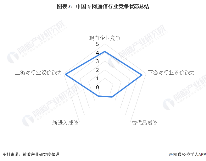 根据以上分析,对各方面的竞争情况进行量化,5代表最大,0代表最小,专网通信设备行业的竞争情况如下图所示。