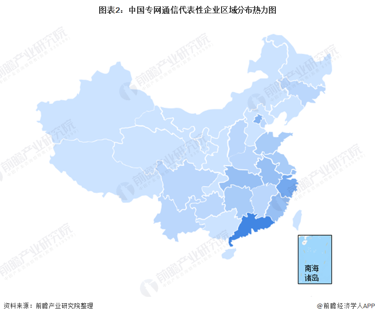 从我国专网通信产业链企业区域分布来看,专网通信产业企业主要分布在广东地区,其次是在浙江、北京地区;中部地区,如湖北、安徽、山西、河南等省份虽然有企业分布,但是数量较少。