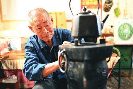 石阳生老人是阳城县润城镇栗氏生铁冶铸技艺传人。栗氏生铁冶铸技艺有600多年的历史,他16岁开始随父学艺,掌握了国家级非遗“阳城生铁冶铸技艺”中的“坩埚炼铁”技艺,是犁镜铁范制作技艺唯一的金火匠人。