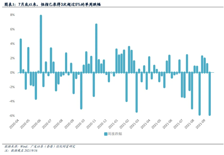 本周前四个交易日恒指出现大幅调整,较9月8日的高位跌去近8%(共2054点),也创下自去年11月拜登上台、全球风险偏好改善以来的低位。这是港股市场在7月底政策风险升温以来出现的第三次单周大跌——此前的7月30日和8月20日当周,恒指的最大回撤分别为2129点和1868点。