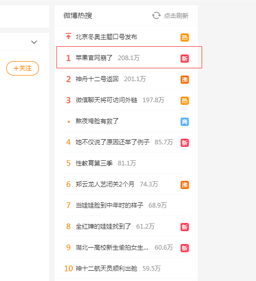晚上21时许,话题“苹果官网崩了”登上微博实时热搜榜第一位。
