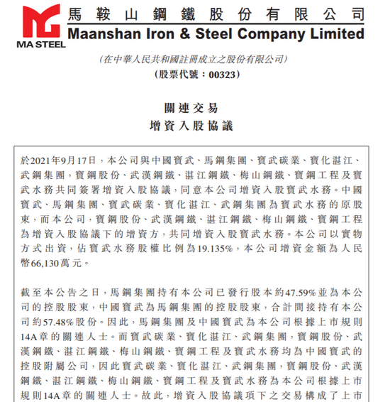 马鞍山钢铁股份(00323.HK)公告,于2021年9月17日,公司与中国宝武、马钢集团、宝武碳业、宝化湛江、武钢集团,宝钢股份、武汉钢铁、湛江钢铁、梅山钢铁、宝钢工程及宝武水务共同签署增资入股协议,同意公司增资入股宝武水务。中国宝武、马钢集团、宝武碳业、宝化湛江、武钢集团为宝武水务的原股东,而公司,宝钢股份、武汉钢铁、湛江钢铁、梅山钢铁、宝钢工程为增资入股协议下的增资方,共同增资入股宝武水务。公司以实物方式出资,占宝武水务股权比例为19.135%,公司增资金额为人民币66,130万元。
