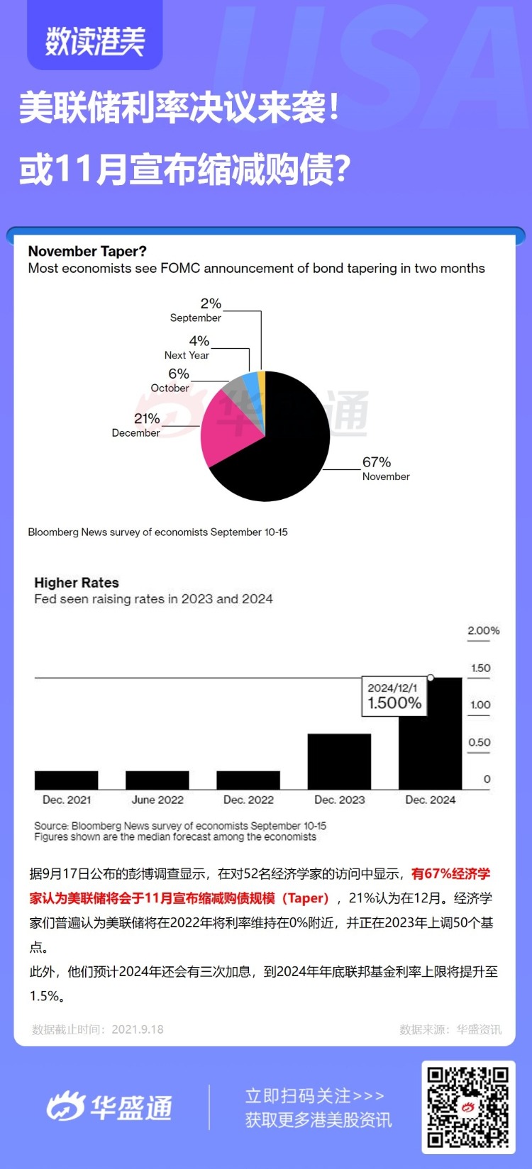在对52名经济学家的访问中显示,有67%经济学家认为美联储将会于11月宣布缩减购债规模(Taper),21%认为在12月。经济学家们普遍认为美联储将在2022年将利率维持在0%附近,并正在2023年上调50个基点。