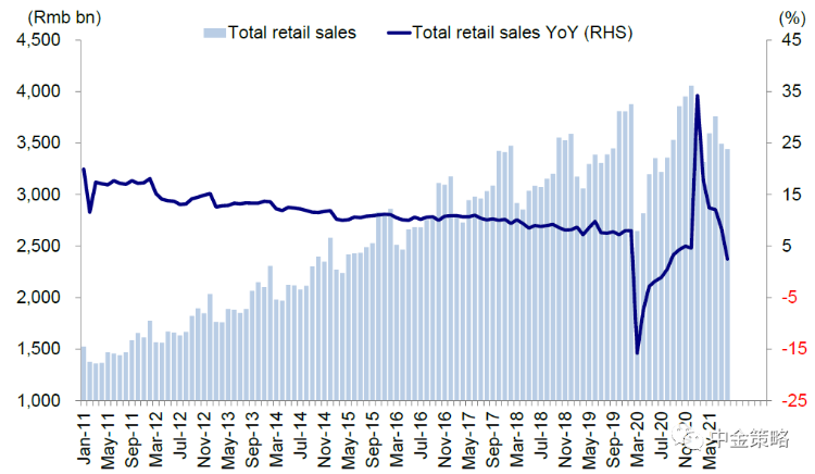 1)8月份中国宏观经济指标普遍放缓。受疫情反弹影响,社会消费品零售总额表现不佳,低迷表现或将持续。8月社零总额同比增速从7月份的8.5%放缓至2.5%,两年年均复合增速1.5%,与7月份相比放缓2.1个百分点,主要受7月底疫情反弹影响。但需要指出的是,疫情期间表现持续亮眼的消费品线上销售在8月份也出现大幅放缓,表明消费疲软可能并非单纯是由于疫情等暂时性因素所致。近期,我们将持续追踪中秋和国庆期间的消费数据。
