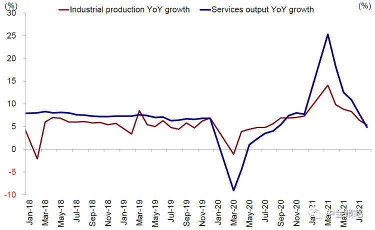 工业和服务活动增速出现放缓。受芯片供应紧张以及限电影响,8月份规模以上工业增加值增速从7月份的6.4%降至5.3%,两年复合增速与7月份相比放缓0.2个百分点。8月份服务业生产指数遭受疫情反弹严重影响,增速从7月份的7.8%放缓至4.8%。