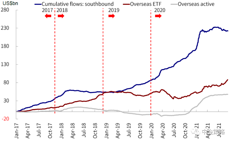 4)南向资金转为流出,海外资金连续20周保持流入势头。在上周港股通三个交易日中,在市场波动背景下南向资金从此前一周的净流入转为净流出,日均净流出规模达到8.09亿港元,而此前一周为日均净流入16亿港元。其中药明生物、美团和小米三支股票南向资金流出规模最大,而腾讯、中海油和港交所则获得内地投资者青睐。上周海外资金流入势头保持不变,流入规模为8000万美元,较此前一周的1.6亿美元规模有所收窄。专注投资H股和海外中资股的海外基金录得2200万美元的净申购(vs.此前一周净申购1.7亿美元)。