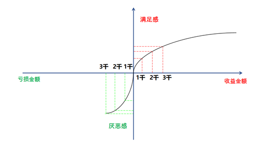 原因其实可以用经济学的边际效用递减的原则,下图的横坐标代表你的实际盈亏,纵坐标代表这些盈亏带给你的满足感和厌恶感。