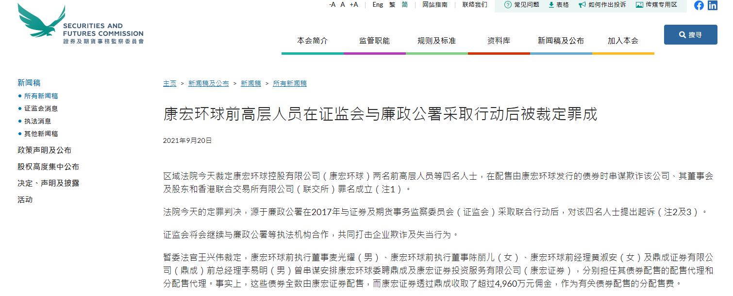 央视网消息:9月20日晚间,香港证监会发布的一份新闻稿称,区域法院今天裁定康宏环球控股有限公司(康宏环球)两名前高层人员等四名人士,在配售由康宏环球发行的债券时串谋欺诈该公司、其董事会及股东和香港联合交易所有限公司(联交所)罪名成立。