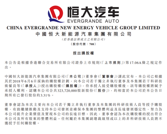 恒大汽车(00708.HK):本公司已根据其于2018年6月6日采纳的购股权计划,向本公司若干独立非执行董事及本集团若干科研技术雇员等授出购股权,待承授人接受购股权后,该等购股权将赋予承授人权利,认购本公司合共3.2372亿股新股份,约相当于本公司于本公告日期所有已发行股份约3.31%。