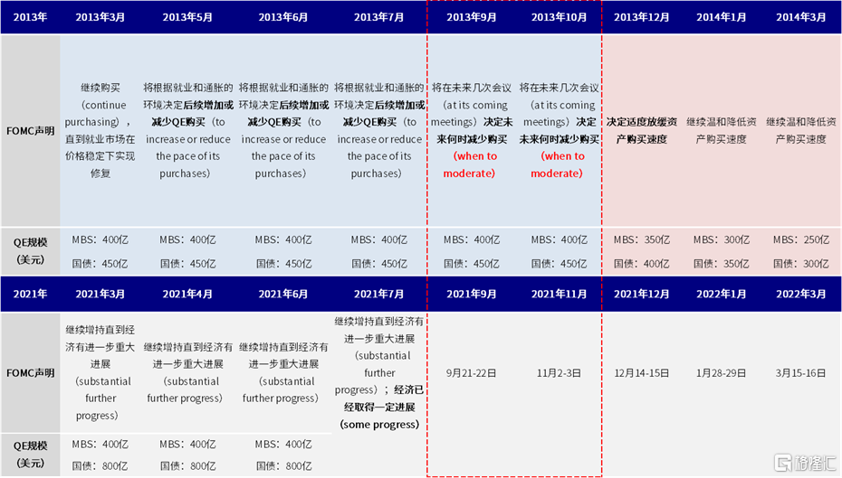 美联储预计不会在此次会议上做出让市场意外的宣布减量或者正式暗示减量的决策,但是一些铺垫式的微小措辞调整依然是不能排除,类似于2013年9月会议时的情形(当年正式官宣减量也要等到年底12月份)。此外,此次会议也是12月份之前最后一次提供点阵图和经济数据预测的会议,市场也为努力从一些微小的变化中寻找对于未来加息路径的潜在指引。虽然在实际操作中,我们一直的观点似乎点针图并没有太大用处,但这并不妨碍市场短期情绪就此进行交易,类似于今年6月点针图给市场传递鹰派预期的情形(《6月FOMC:散点图大幅改变美联储退出节奏了么?》)。