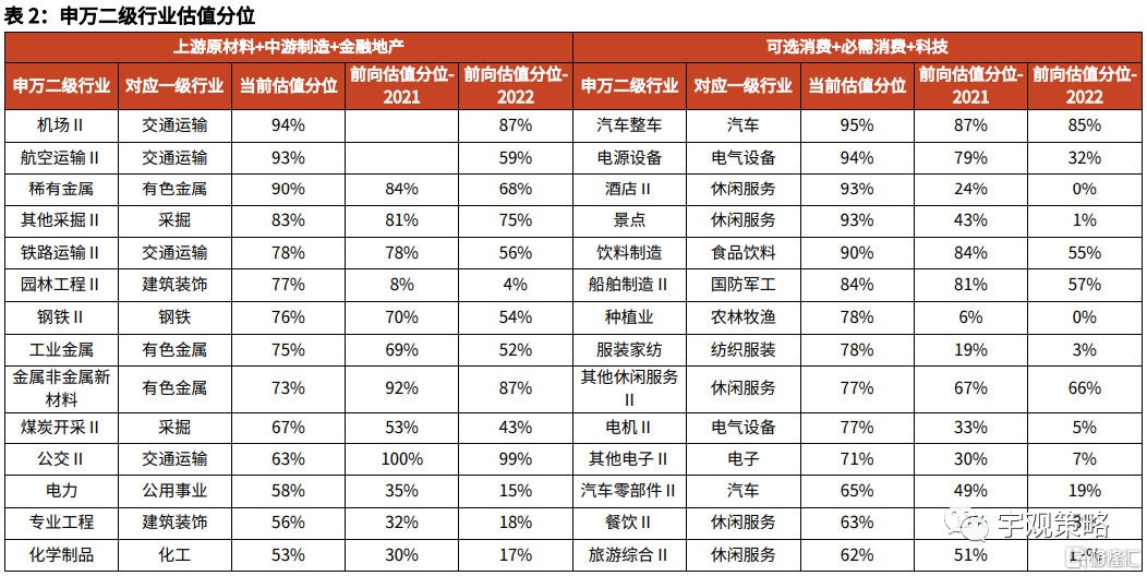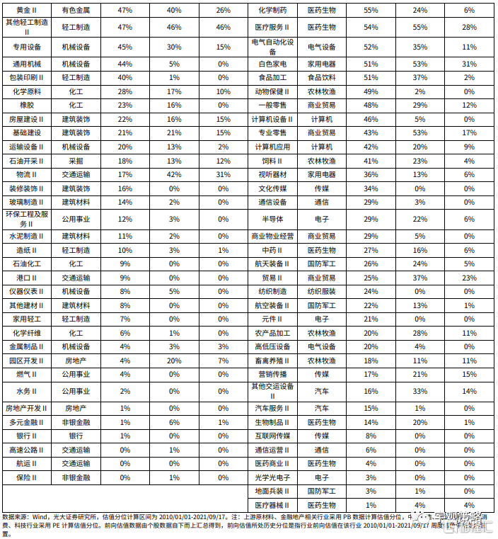 鉴于各行业经营特点差异,我们对上游原材料及金融地产板块采用PB估值,对中游制造、必需消费、可选消费、科技板块采用PE估值。我们将申万行业分为上游原材料、中游制造、必需消费、可选消费、科技、金融地产等六大类,由于不同行业往往适用于不同的估值方法,为保证各行业估值的合理性,在本报告中,我们对上游原材料及金融地产板块采用PB估值,对中游制造、必需消费、可选消费、科技板块采用PE估值[1]。