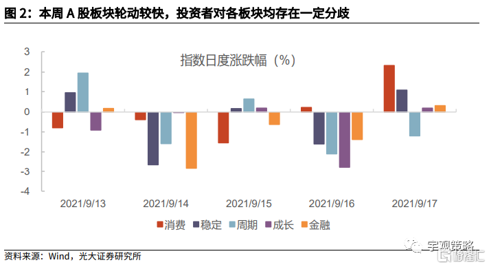 近期,A股行业轮动明显加快,其背后所反映的是投资者对各个板块均存在较大分歧。以本周为例,周一,钢铁、煤炭等周期板块领涨,周二,周期板块大幅回调,成长板块表现较好,周三,周期板块再次领涨,周四及周五,消费板块领涨,周期、成长板块再次回调。行业轮动的加快,意味着投资者对各个板块均存在较大分歧,因而市场难以形成合力,市场也难以形成明确的领涨主线。