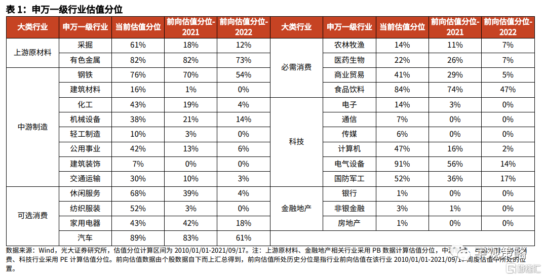 从一级行业角度看,原材料行业估值普遍处于历史相对较高水平,基建产业链估值普遍较低,同时大部分消费及TMT行业估值已回落至历史较低水平。对于近期持续领涨的采掘、有色、钢铁等涨价行业,其PB估值均已经位于历史较高水平,即使将今年下半年及明年业绩增长考虑进来,其前向估值也仍处于历史中等偏高水平,在此背景下,投资可重点关注未来限产确定性高且产品价格仍具备上涨空间的细分行业,主要包括钢铁、纯碱、黄磷、电石等[2];对于中游制造行板块,大部分中游行业当前估值已低于历史50%估值分位,建筑材料、建筑装饰、轻工制造行业PE估值低于2010年以来20%估值分位;对于可选消费及必需消费板块,除汽车和食品饮料板块外,当前大部分消费行业估值已回落至历史较低水平,如果将明年业绩增长考虑进来,则食品饮料板块2022年业绩所对应的估值水平也已经回落至历史中位数以下;对于科技板块,电子、通信行业估值已回落至历史底部区间,尽管当前电气设备行业估值处于历史高位,但在高业绩增速支撑下,电气设备行业2022年净利润所对应的估值水平仍处于历史较低水平,这意味着,电气设备行业大概率能够通过高业绩增长来消化其高估值,其仍值得持续关注。