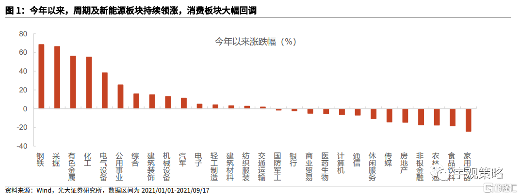 今年以来,A股行情结构分化明显,周期及新能源板块领涨,消费板块大幅回调。今年以来,A股行情结构分化明显,在碳中和约束下,钢铁、煤炭等资源品行业供给受限,资源品价格持续上涨,进而推动相应板块股价持续上涨。与此同时,新能源汽车、光伏行业持续放量推动新能源板块持续上涨。与之相比,消费板块今年整体表现不佳,家用电器、食品饮料、农林牧渔等行业今年以来累计跌幅均在20%左右。