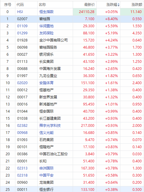 9月21日消息,港股午后再度翻红,早盘曾跌超1%,地产股走高,成分股中,碧桂园涨超8%,华润置地、友邦保险涨超5%,碧桂园服务涨超3%,长实集团涨近3%,安踏体育涨超1%。