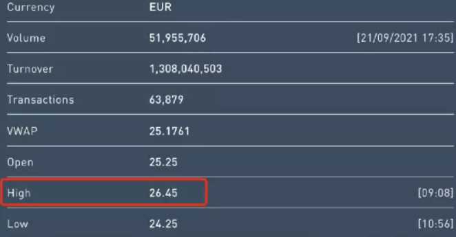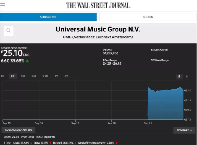 上市首日,环球音乐就迎来股价飙升,盘中股价一度触及26.45欧元,与18.5欧元的上市参考价相比飙升42.97%。