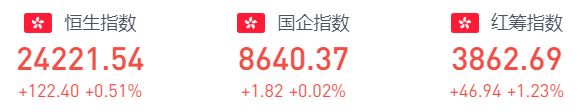 截至9月21日周二收盘,恒生指数上涨122.40点或0.51%,报24221.54点;国企指数微涨1.82点或0.02%,报8640.37点;红筹指数上涨46.94点或1.23%,报3862.69点。