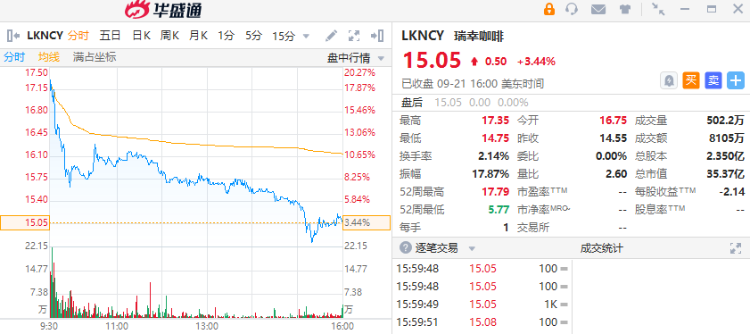 公告发布后,瑞幸咖啡粉单一度涨逾18%,截至发稿,涨幅回调至3.44%,每股报15.05美元,总市值为38.10亿美元。值得注意的是,去年6月瑞幸咖啡退市时,股价为1.38美元,市值为3.21亿美元,这意味着从退市至今,瑞幸咖啡的市值涨幅超10倍。